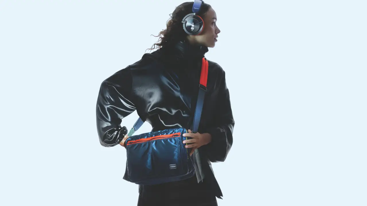 Every Porter shoulder bag is hand-assembled in Japan, composed of 77 thoughtfully considered components, each one chosen for function, texture, and aesthetic harmony. The external headphone holder is sculptural yet discreet, while the compact navy silhouette, accented with Porter’s signature orange and khaki, balances utility with streetwise elegance. A resin “tech slice” dangles, encapsulating sketches and components from the OnTrac headphones’ development — a miniature diary of creation. And every bag is numbered, each a rare piece in a collection that is as much about desire as it is design.
