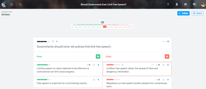 Kialo es un sitio relativamente nuevo donde puedes unirte a debates y discusiones profundos sobre una variedad de temas profundos e interesantes. Sin embargo, lo que hace que Kialo sea diferente es la forma en que se estructuran las discusiones (ver arriba). Los puntos de debate se ordenan en pros y contras. Luego puedes hacer clic en cualquiera de esos puntos para explorar (y contribuir) los pros y los contras de ese punto específico. Esto te ayuda a obtener una comprensión profunda del tema en cuestión.