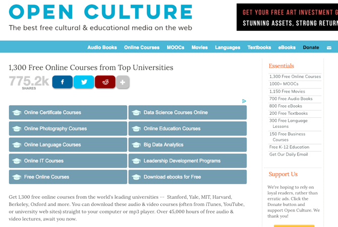 Si prefieres aprender algo más sobre humanidades, Open Culture tiene una gran cantidad de cursos gratuitos en línea y medios educativos para que puedas elegir. Estos van desde series completas de conferencias hasta audiolibros de acceso gratuito.