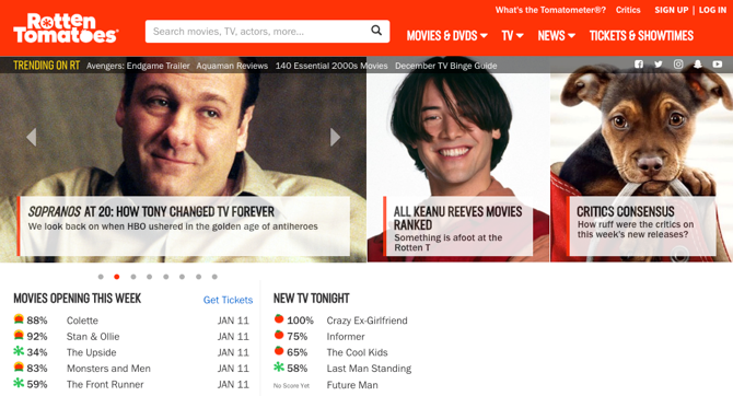 ¿Quieres saber si una película es buena antes de verla? Rotten Tomatoes agrega reseñas, las categoriza como positivas o negativas y luego las promedia. El resultado es una evaluación simple e imparcial de las probabilidades de que te guste la película.