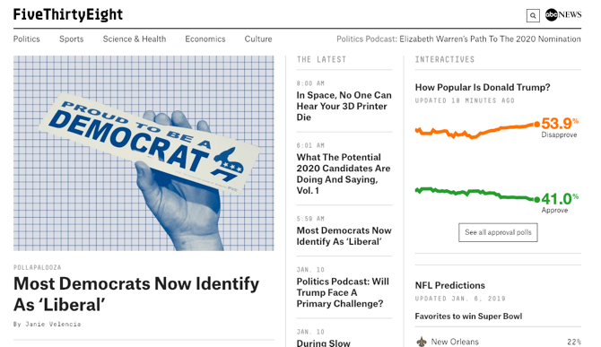 538 es el producto del estadístico Nate Silver, conocido por predecir casi a la perfección el resultado de las elecciones políticas de 2012 a través de una combinación de modelos estadísticos sobrios y brujería a la antigua. El sitio proporciona blogs de noticias desde una perspectiva centrada en los datos y, a menudo, ofrece una visión interesante y quizás más sobria en comparación con las redes de noticias tradicionales de veinticuatro horas.